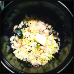 2. Heat the butter and oil in a pan large enough to easily fit the mussels, Throw in the shallots ,fennel, garlic bay leaves, then cook for 3-5 min`s until softened.