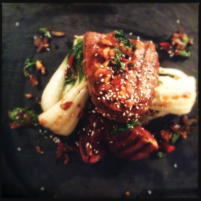 Soy and Lime marinated Chargrilled Tuna with a Spicy Bok Choi Stir fry