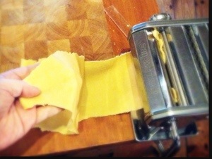 4, Roll out one half of the dough until 1cm/½in thick, then feed it through a pasta machine. Start on the thickest setting, passing the sheet through several times and lowering the setting until it reaches the thinnest setting.