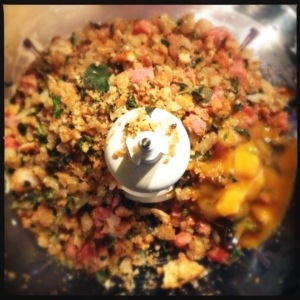 2, Add the breadcrumbs and a generous handful of herbs to the pan. Stir and then transfer to a blender. Add the egg yolk and pulse to combine.