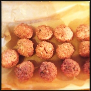 4, Put the meatballs into a hot pan with a splash of oil and fry until brown all over (don’t overcrowd , it can be done in 2 batches). Remove from the pan and set aside.