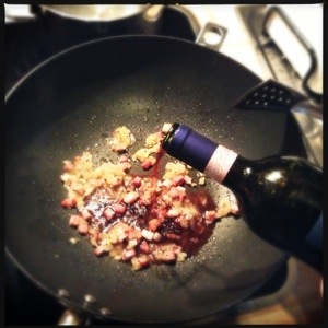 5, Add the reserved onion and pancetta mixture to the pan. Deglaze by adding the red wine and scraping all the bits off the bottom of the pan. When the wine is boiling, add the chopped fresh tomatoes, keeping the heat high. Continue to cook, stirring all the time until they start to break down. Add the tinned tomatoes and a tin full of water. Bring back to the boil.