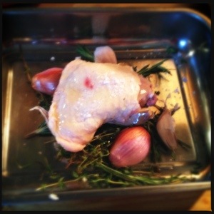 2: in an oven proof dish make a bed out of the rosemary,thyme, halved shallot and garlic , pat dry the chicken pieces , season and place on top of its herby bed and dress with olive oil, cook in oven for aprox 20/25 mins until skin is crispy and cooked through.