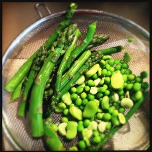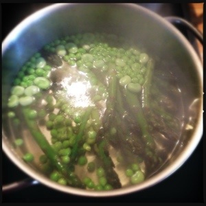 3: prepare your peas, broad beans and asparagus (tip for asparagus see above ) for blanching