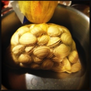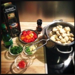 1 kg small clams, from sustainable sources, I’m using Venus clams, scrubbed clean