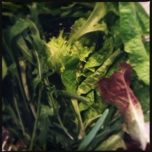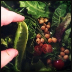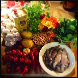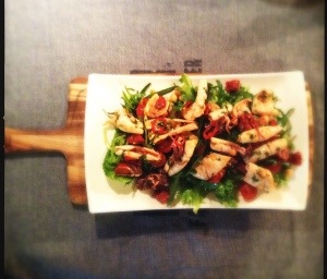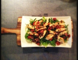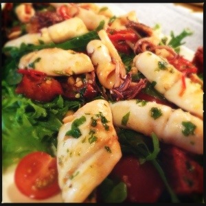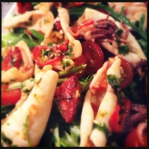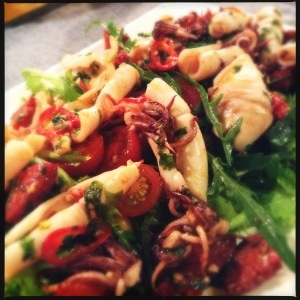 7.Briefly toss the rocket leaves through the chickpea salad and spoon onto 1 large or 4 individual plates. Top with the sautéed squid and chorizo and serve.