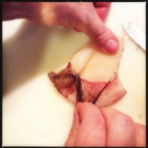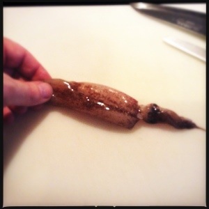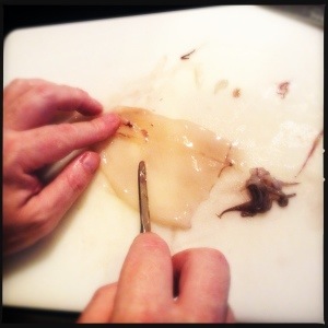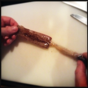 5. Either slice the body of the squid into rings, or cut down one side of it, open it out, scrape away any traces of guts left inside the body, then score the inside lightly in a cross-hatch pattern.