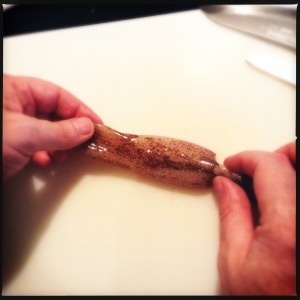 2. -Feel inside the body for the quill (it resembles a shard of plastic). Pull it out of the squid and discard.