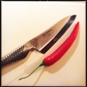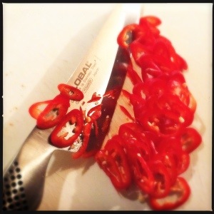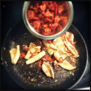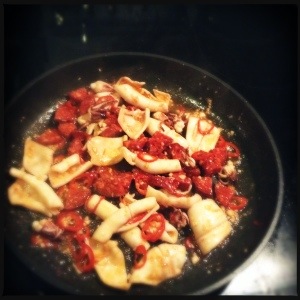 5. Once at a high temperature ( the oil should start to smoke ) add the squid pieces, scored side facing upwards first (this will make them curl attractively), the chilli, garlic and the tentacles and sear for 30 seconds, then turn them over and sear for another 30 seconds until golden brown and caramelized. Season with salt and pepper