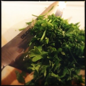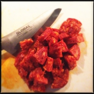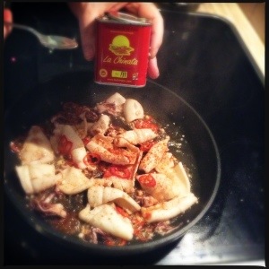 6. Throw in the chorizo and toss together over a high heat for a further minute. add parsley and pimenton toss all together.