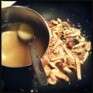 3, Add the fish stock and bring to a simmer. Continue to cook until most of the stock has evaporated. Stir in the chopped Serrano ham.