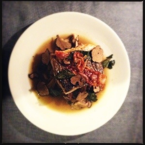 Sea bass with sautéed porcini, wild mushrooms, sage, crispy Serrano ham and Truffle