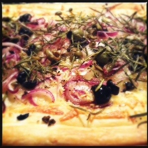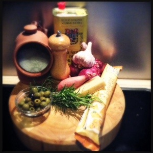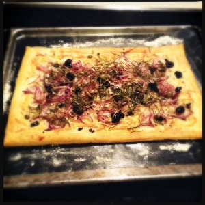 4. Scatter within the scored edges with onion, cheese, olives and rosemary.