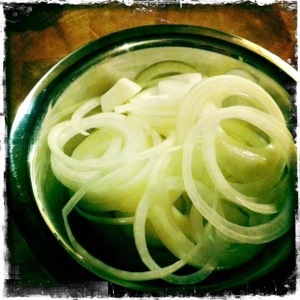 2,Fry the sliced onions gently in the oil, add the spices and chilli and cook for 2-3 minutes.