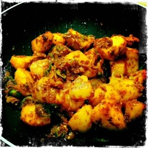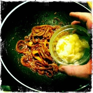 5, Add to the onion mixture and stir fry all golden brown. Add any extra oil.