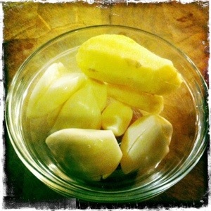 4. Meanwhile, in a food processor, blend the garlic cloves and ginger with one tablespoon of water to a fine paste.
