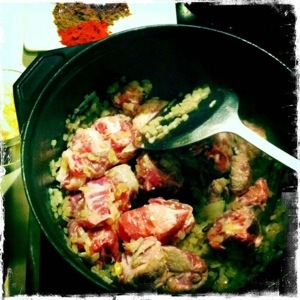 3. Add the lamb pieces and fry for 3-4 minutes, stirring continually, until golden-brown all over.