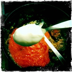 6. Stir in the powdered coriander, cumin, red chilli powder, fennel seeds, garam masala, salt, tomato pulp and yoghurt, cover the pan with a lid, then reduce the heat to a low heat and simmer for 10-12 minutes, or until the sauce has almost completely dried out.
