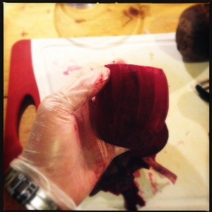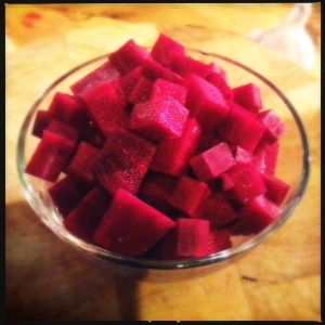350g (12oz) fresh beetroot, peeled and diced. ( while peeling and chopping wear latex gloves, otherwise you lend up with red fingers )