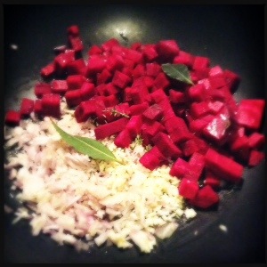 2, Heat the oil in a shallow heavy-based pan. Sauté the shallot, garlic, bay leaves, beetroot and half of the thyme until softened (about 6-8 minutes).