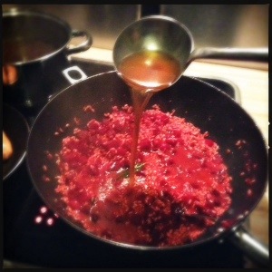 5, add one ladleful of hot stock let it simmer, stirring all the time until it has been absorbed.