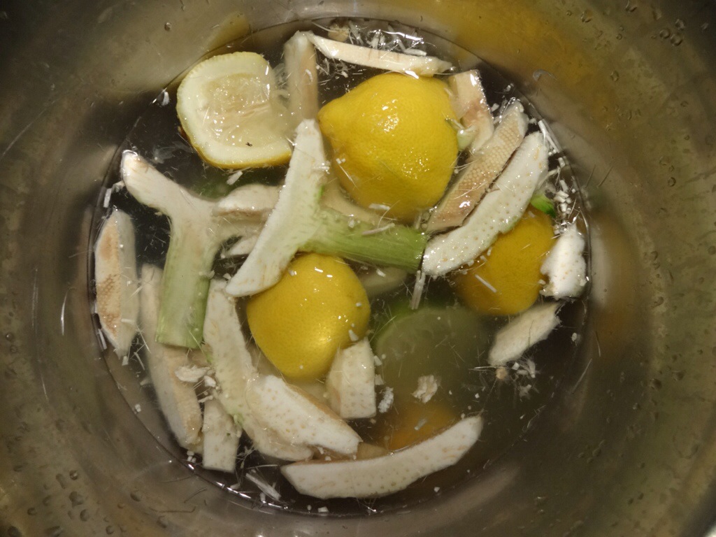 1. Fill a bowl with cold water, then squeeze in the juice of a lemon and add some lemon slices. Have a halved lemon to hand to rub over the cut edges of the artichoke as you prepare it. The lemon juice will prevent the artichoke from oxidising and turning brown.