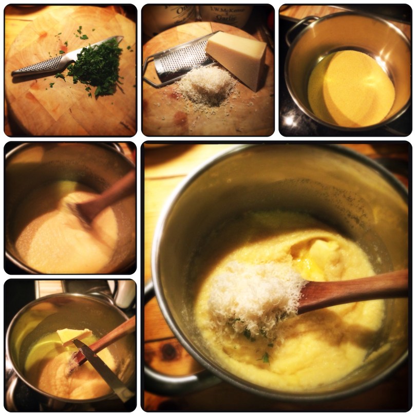 Pollo alla Cacciatora servito con erbe e parmigiano polenta, hunters chicken served with a herb and parmesan polenta