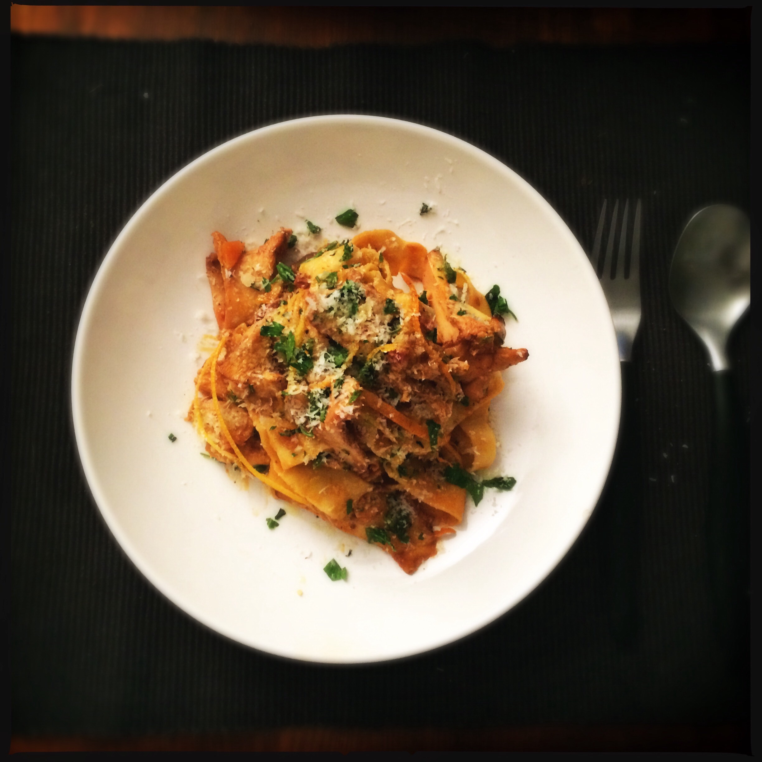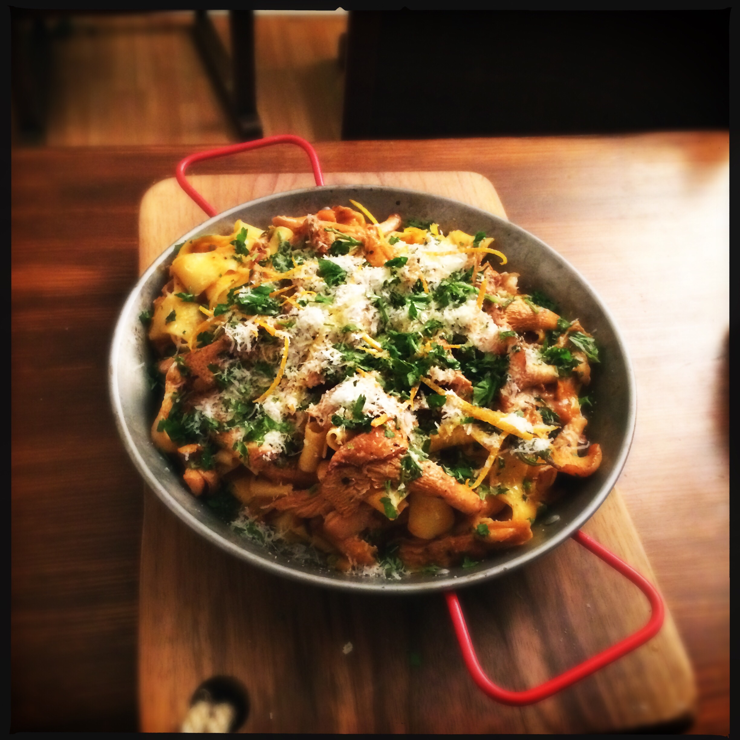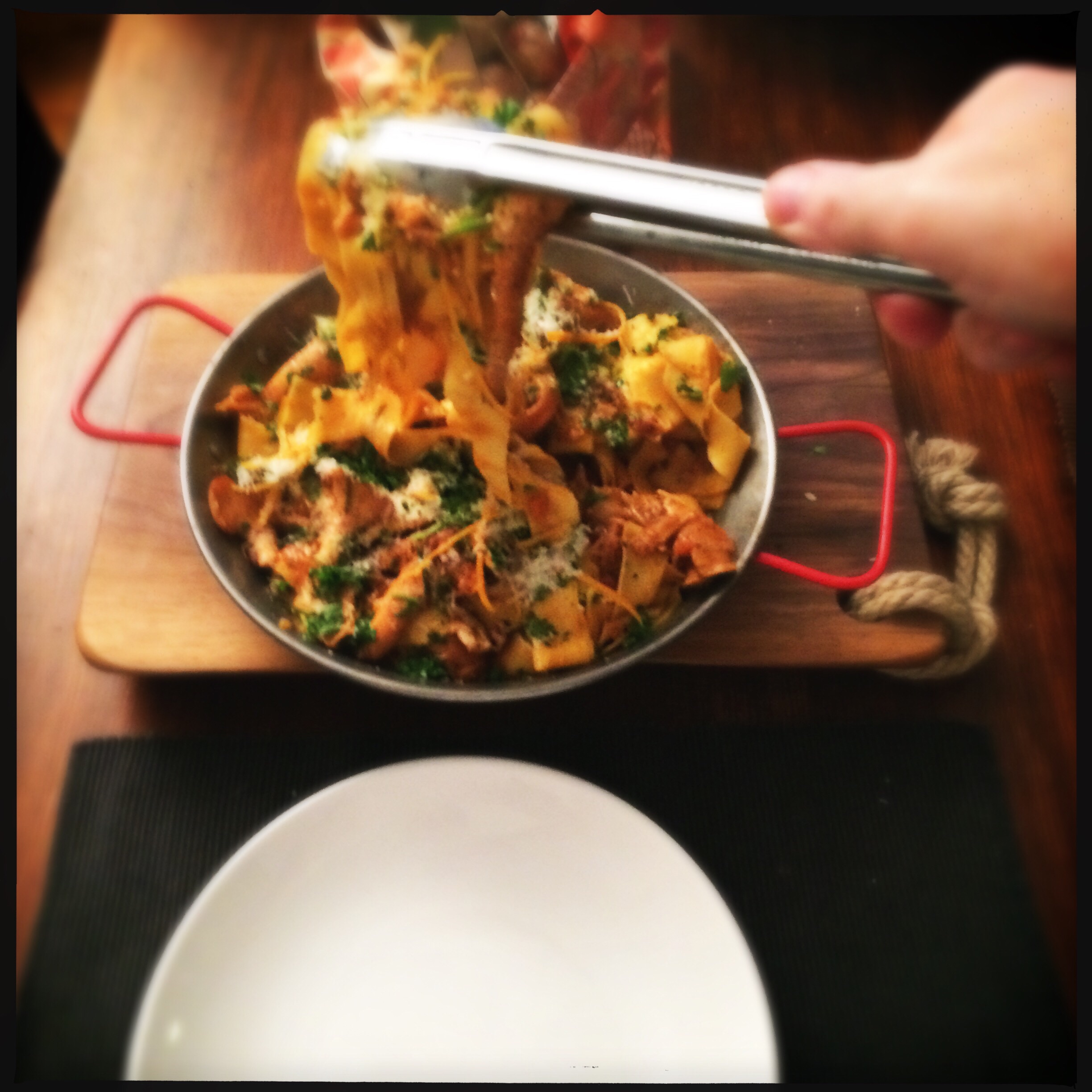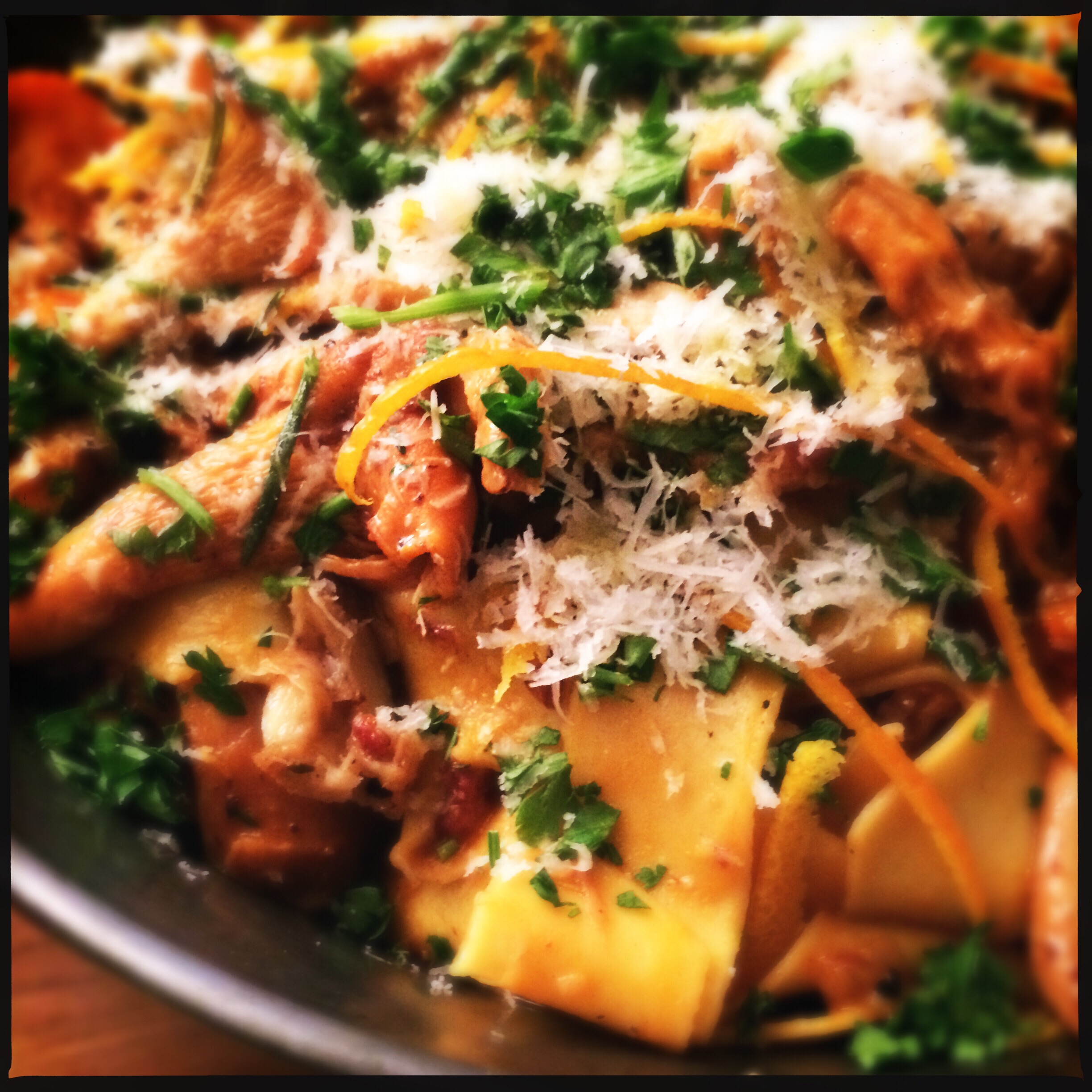 Braised pappardelle rabbit with chanterelles. Brasato di coniglio papadelle con finferli