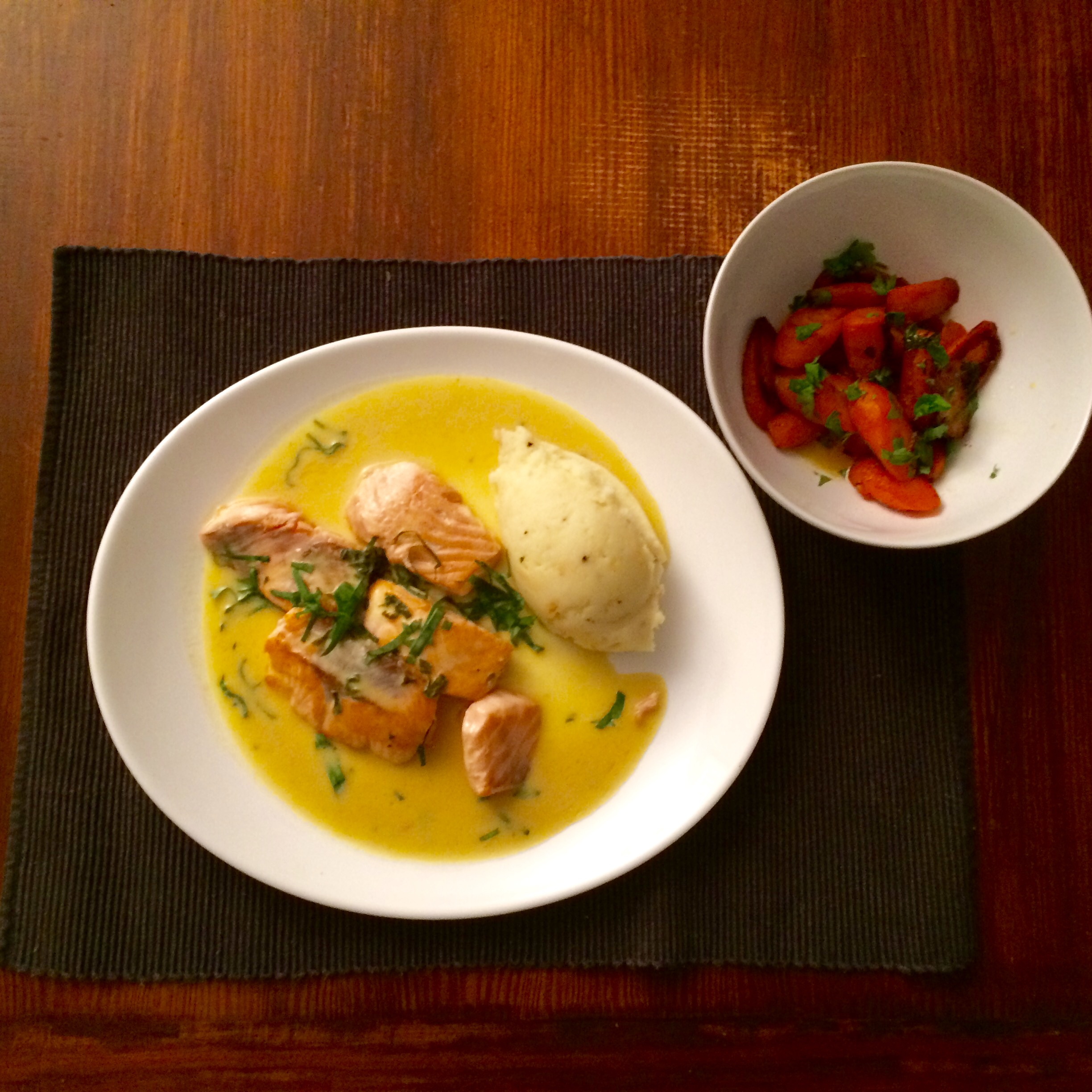 Escalopes of salmon with a saffron sorrel sauce, Vichy carrots and creamy mashed potatoes