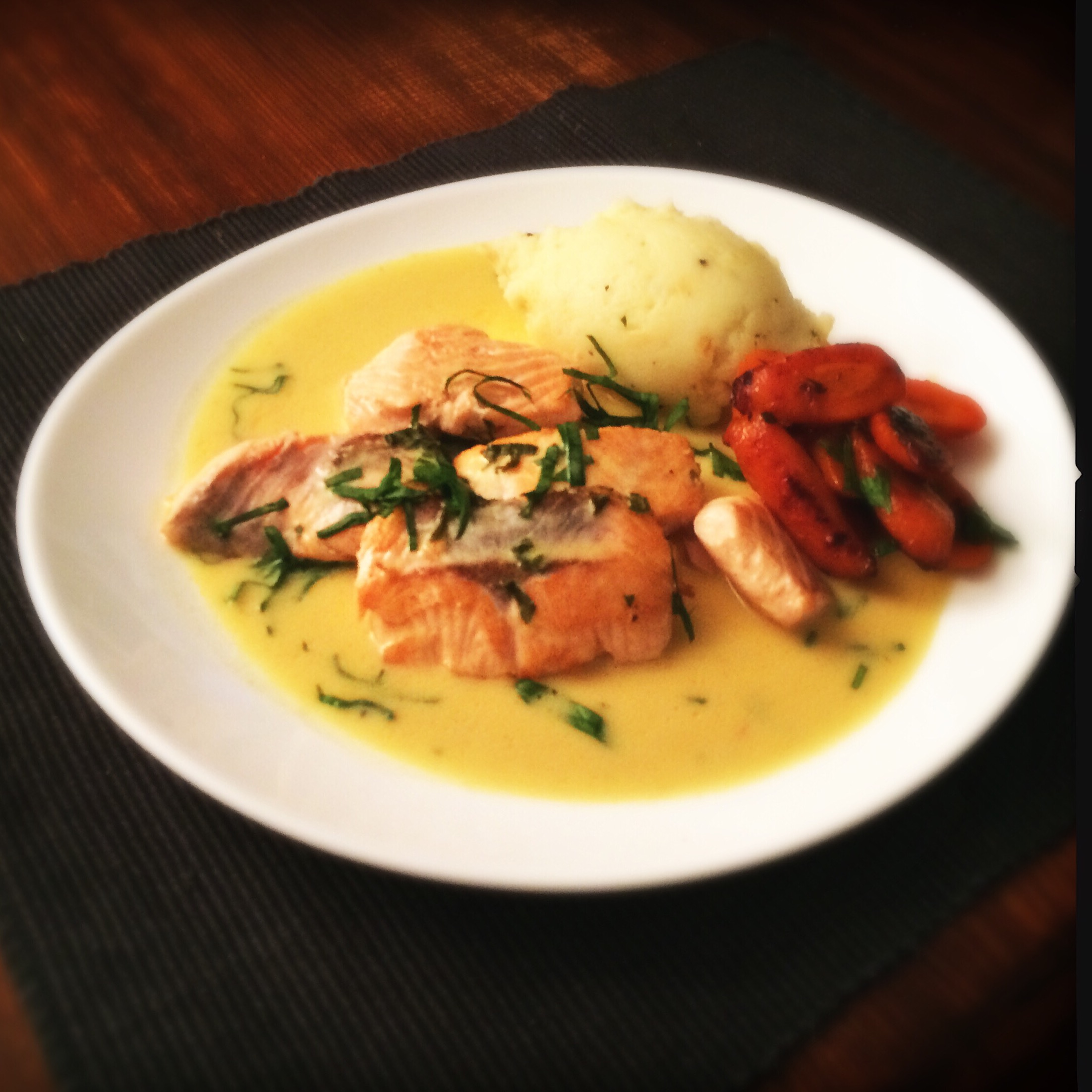 Escalopes of salmon with a saffron sorrel sauce, Vichy carrots and creamy mashed potatoes