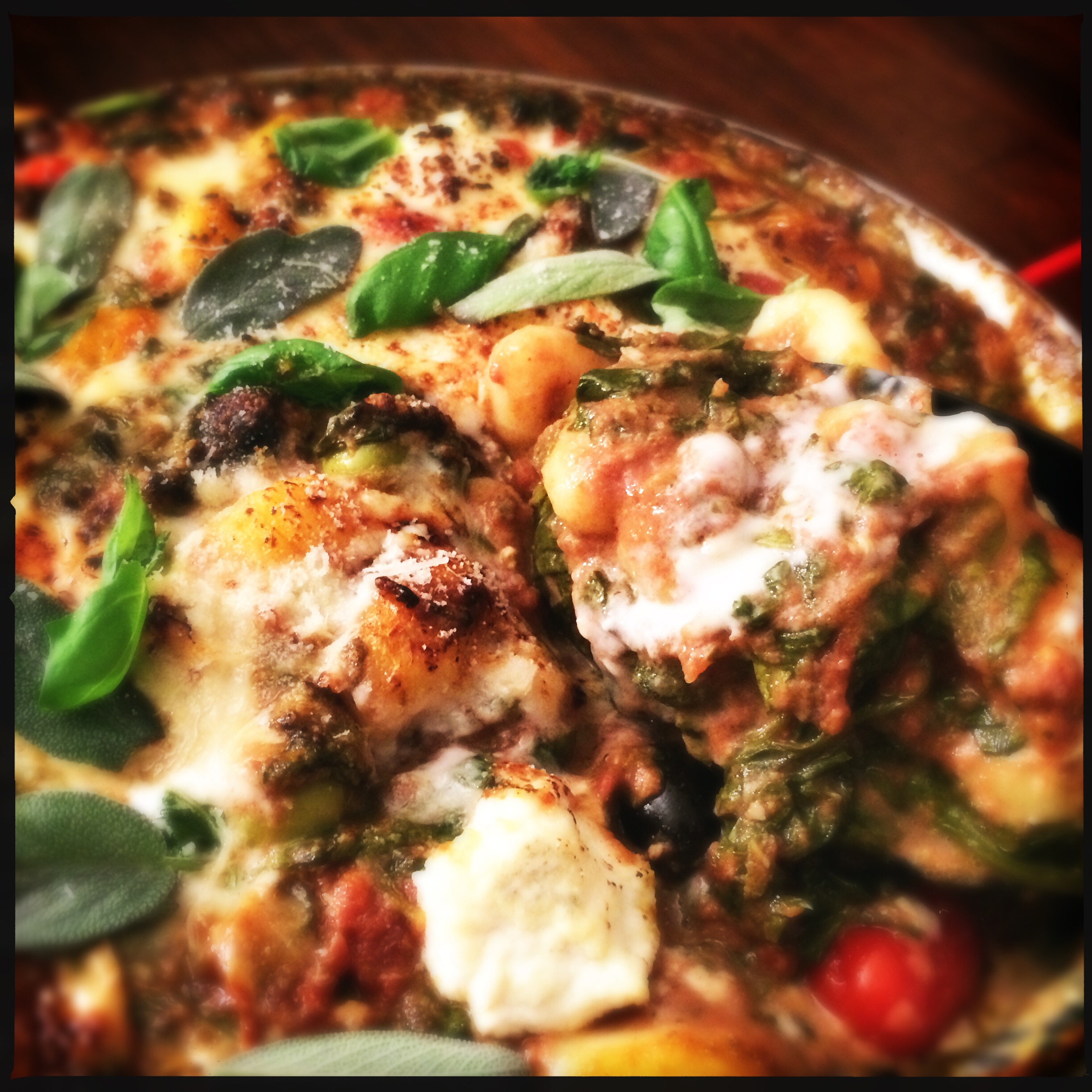 One-Pan Spinach and Cheese Gnocchi with Roasted Garlic Tomato Cream Sauce.