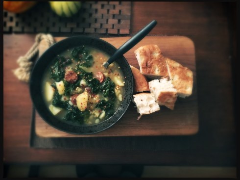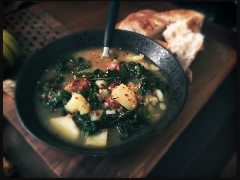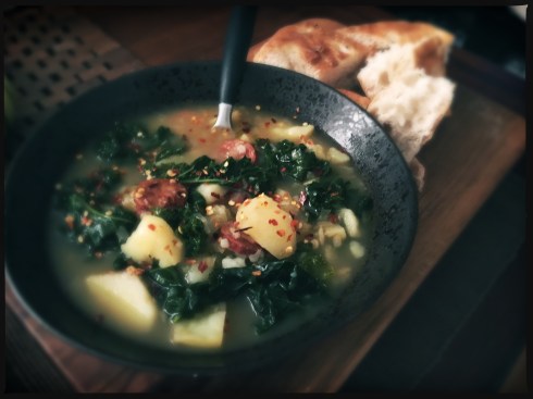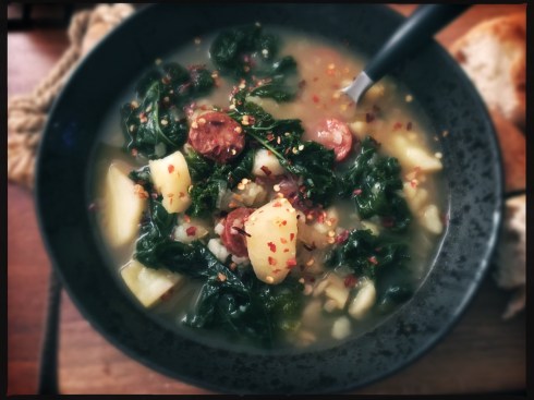 Caldo verde, literally “green soup,” is a traditional Portuguese and Brazilian dish made of potatoes and kale. It gets its distinctive green coloring from the kale, and is traditionally served with Portuguese sausage such as chouriço or linguiça, though other meats may be used instead. Caldo verde is commonly served at Portuguese and Brazilian celebrations. It is often considered Portugal’s national dish, and is served all over the country, from peasant households to luxury hotels.