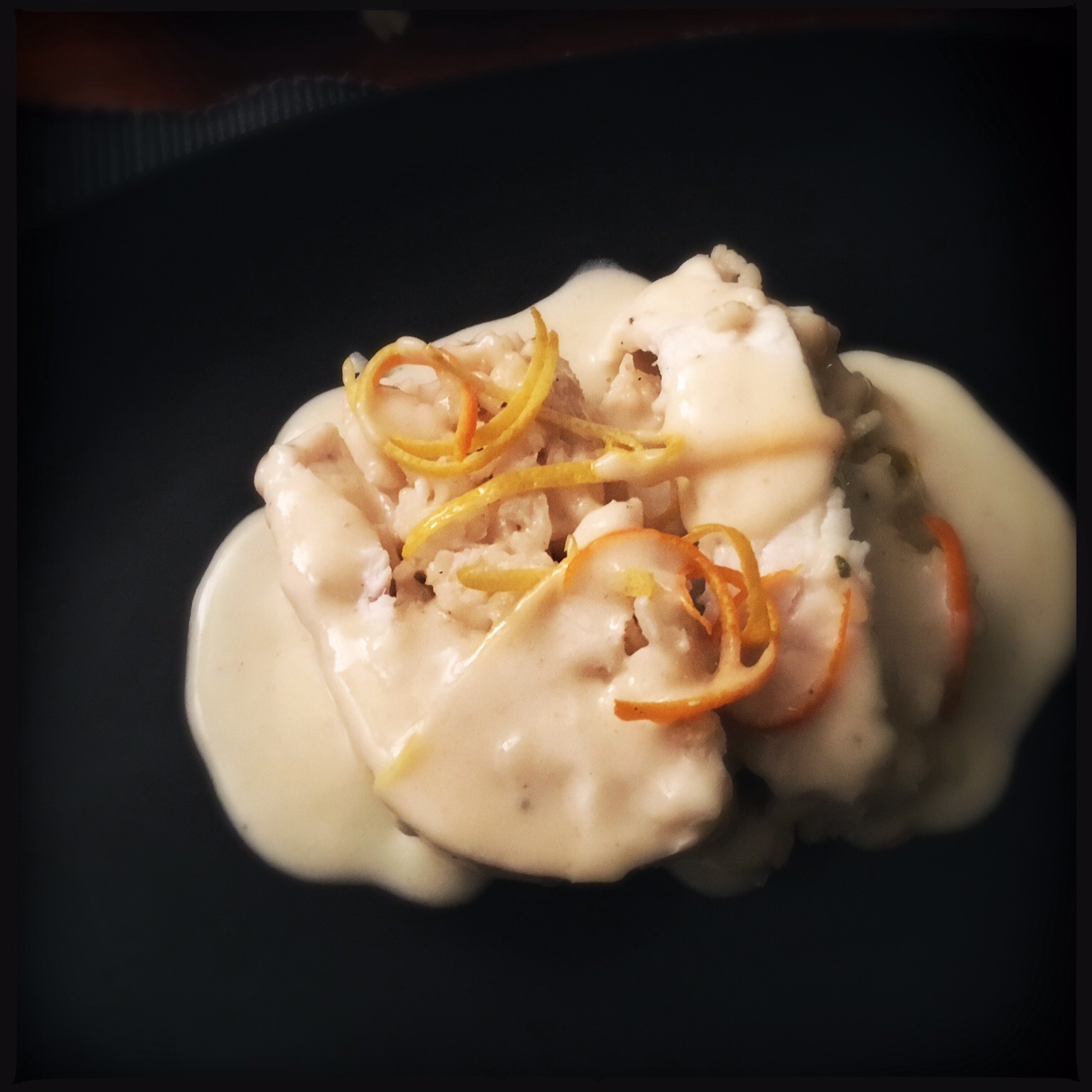 Baked lemon sole and risotto terrine with a cream prosecco sauce,