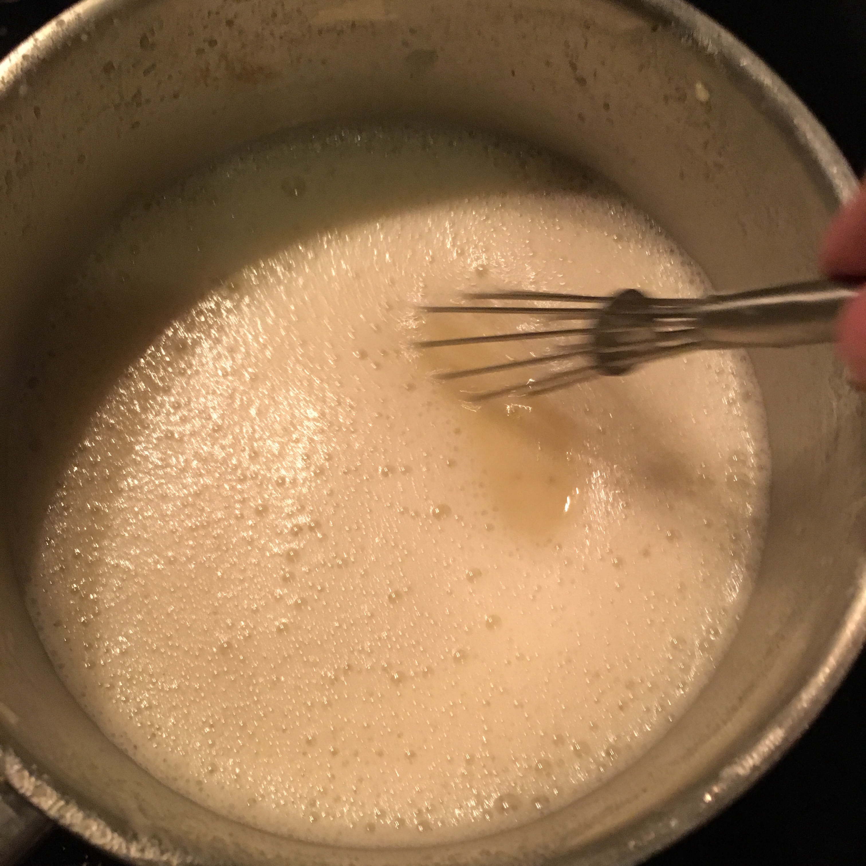 6 Pour the butter into a wide pan (large enough to fit all 4 pieces of cod) and warm through gently to 60°C. Add the cod and gently poach for 5 minutes on each side, being careful to keep the temperature low