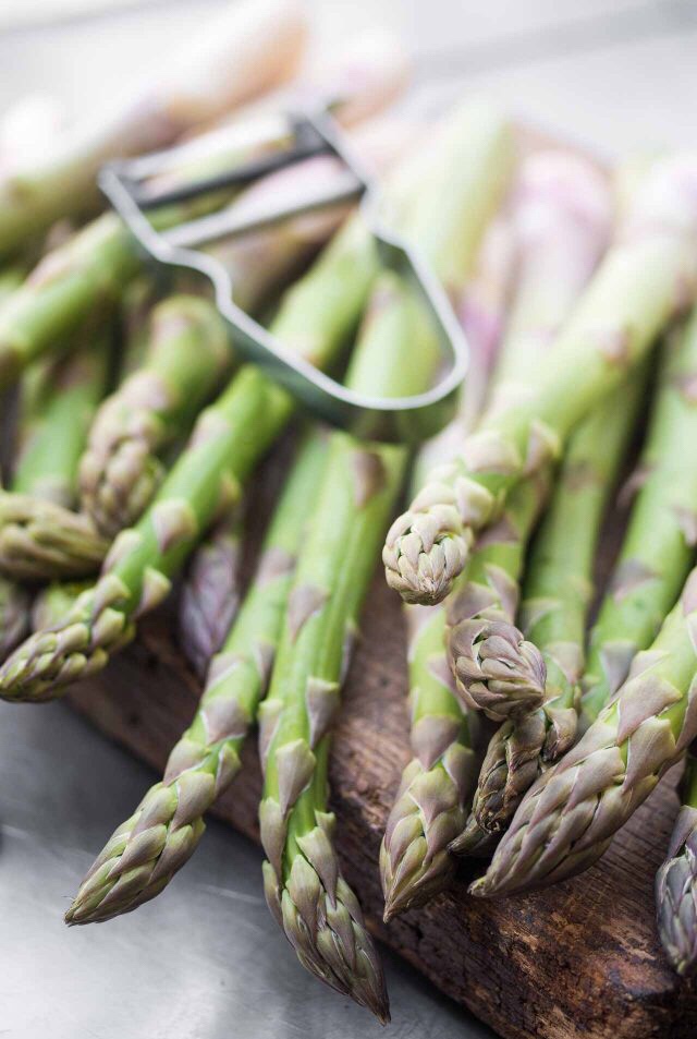 7 While poaching, griddle the asparagus spears for 2 minutes until tender, turning regularly. Thinly slice the cooked spears into 2mm thick rounds and season with a little lemon juice, salt and some of the butter from cooking the cod