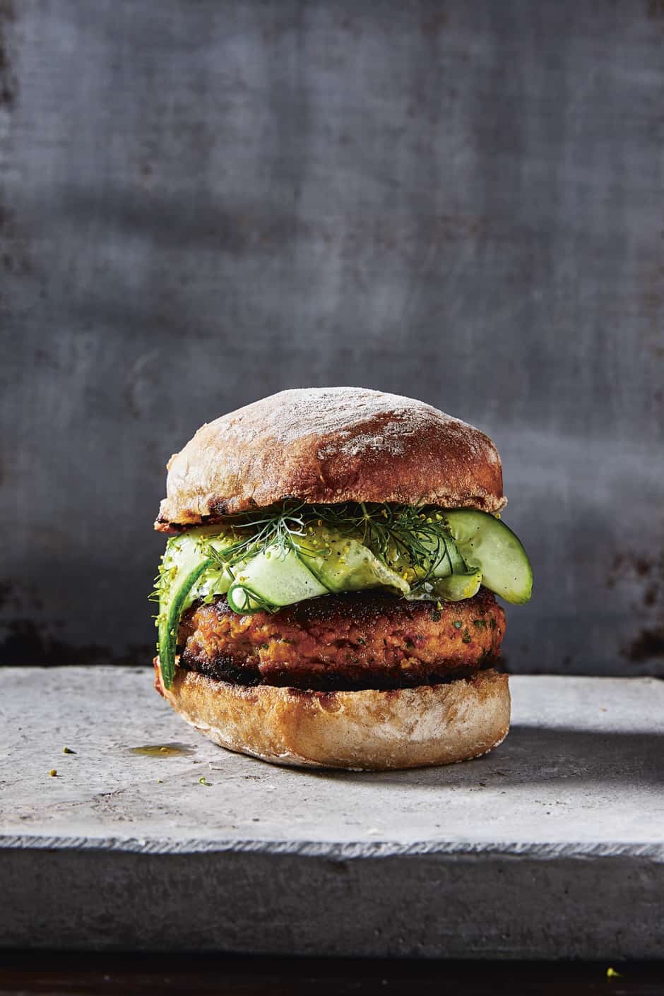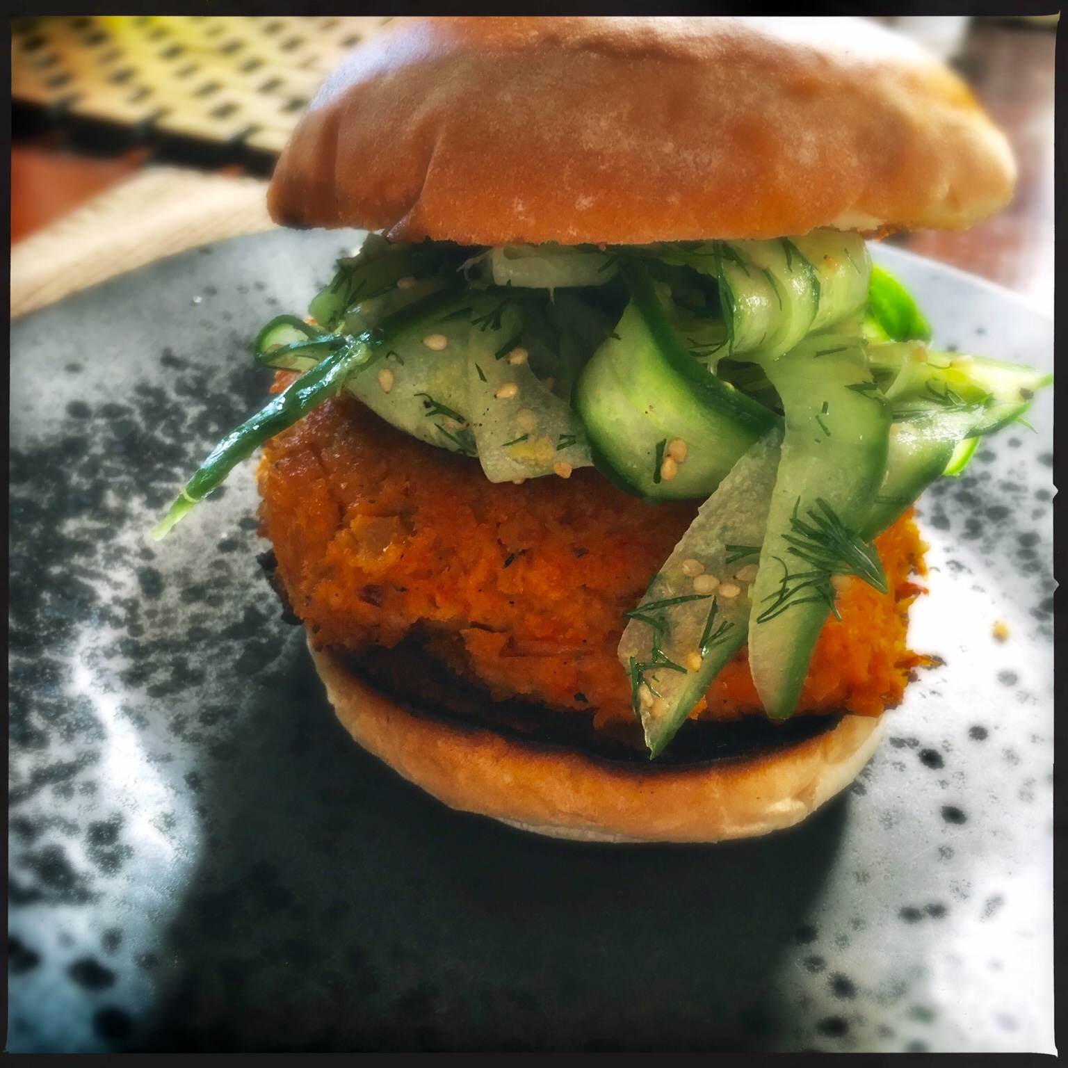 There’s more to veggie burgers than beans and lentils. This meat-free option comes from chef Martin Nordins fantastic book green burgers. With his permission I’m able to share this recipe with you , but I have added lemon juice to the cucumber salad as a slight touch of sourness is my preference.